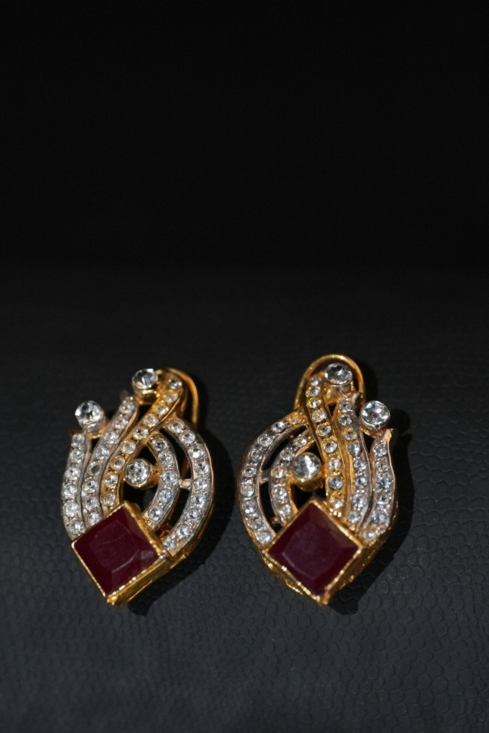 Key Features: Elegant Design: Gold earrings with a diamond swirl design featuring a bold red square stone in the center. Diamond Detailing: Sparkling diamonds enhance the swirl design, adding brilliance and luxury. Bold Red Square Stone: A striking red square stone at the center for a bold, sophisticated look. Timeless Elegance: Perfect for weddings, formal events, or making a statement with any outfit. A.S XPRESSION JEWELLERY; Elegant Gold and Diamond Swirl Earrings featuring a Bold Red Square Stone in the Center The Elegant Gold and Diamond Swirl Earrings are a stunning fusion of luxury and bold design. The diamond swirl adds sparkling elegance, while the bold red square stone at the center commands attention, creating a powerful yet refined statement. The gold setting enhances the overall sophistication, making these earrings perfect for weddings, special events, or any occasion where you want to stand out. These earrings combine timeless elegance with modern flair, ensuring they will remain a standout piece in your jewellery collection for years to come.