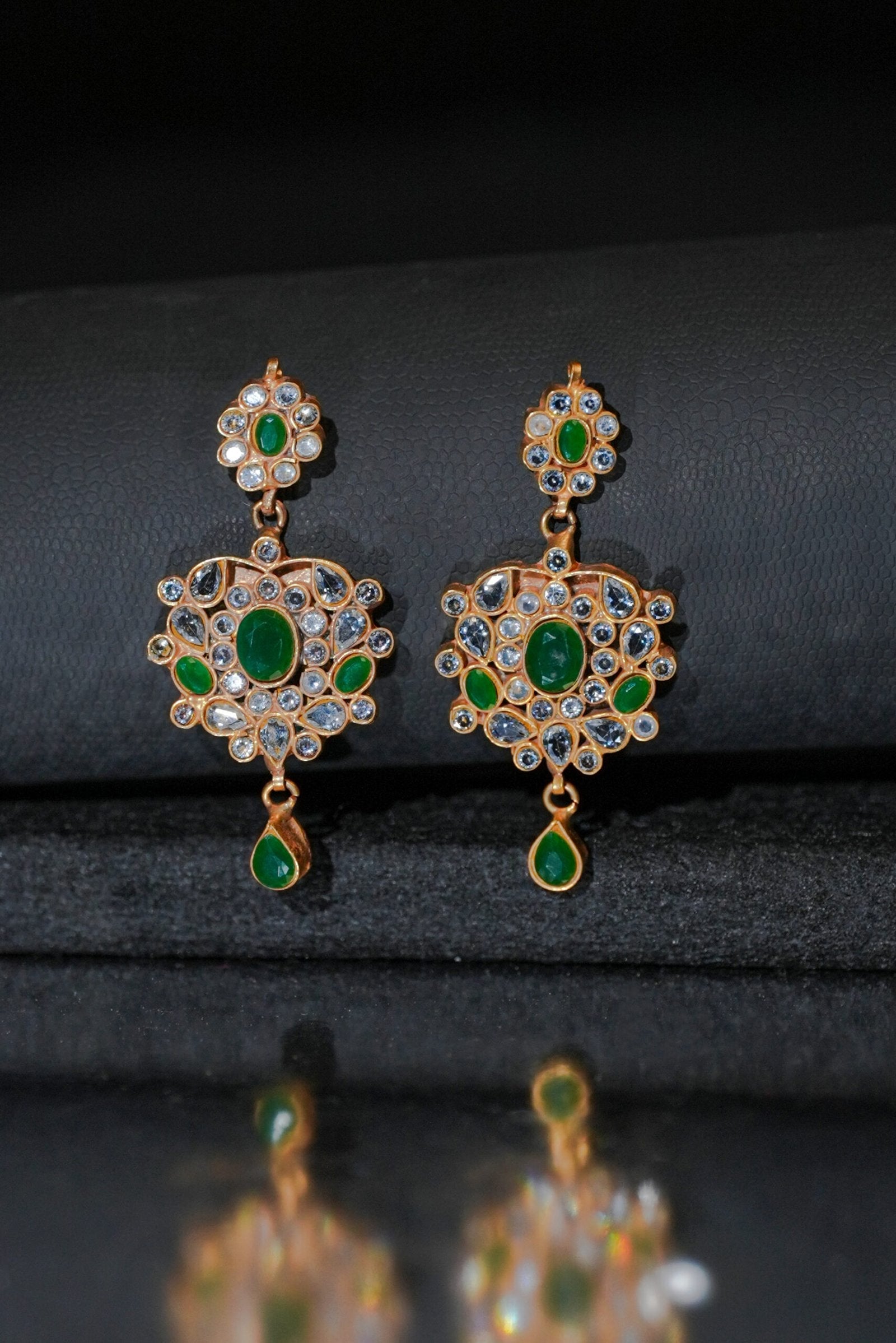 Key Features: Antique-Style Design: Vintage-inspired danglers with intricate detailing for a timeless look. Cross Pattern: Unique green stones arranged in a cross pattern for an elegant and symbolic touch. High-Quality Craftsmanship: Carefully crafted with fine materials for durability and luxury. Versatile Wear: Ideal for formal events, cultural celebrations, or adding sophistication to your daily attire. A.S XPRESSION JEWELLERY; Antique-Style Danglers with Green Stones Forming a Cross Pattern Embrace timeless elegance with these Antique-Style Danglers, featuring a distinctive cross pattern made of rich green stones. The intricate detailing and vintage-inspired design make these earrings a standout piece for anyone who loves classic luxury with a twist of modern symbolism. The green stones add a touch of color, while the antique style evokes a sense of nostalgia and refinement. Perfect for weddings, cultural events, or any special occasion, these earrings will complement your attire with sophistication and grace.