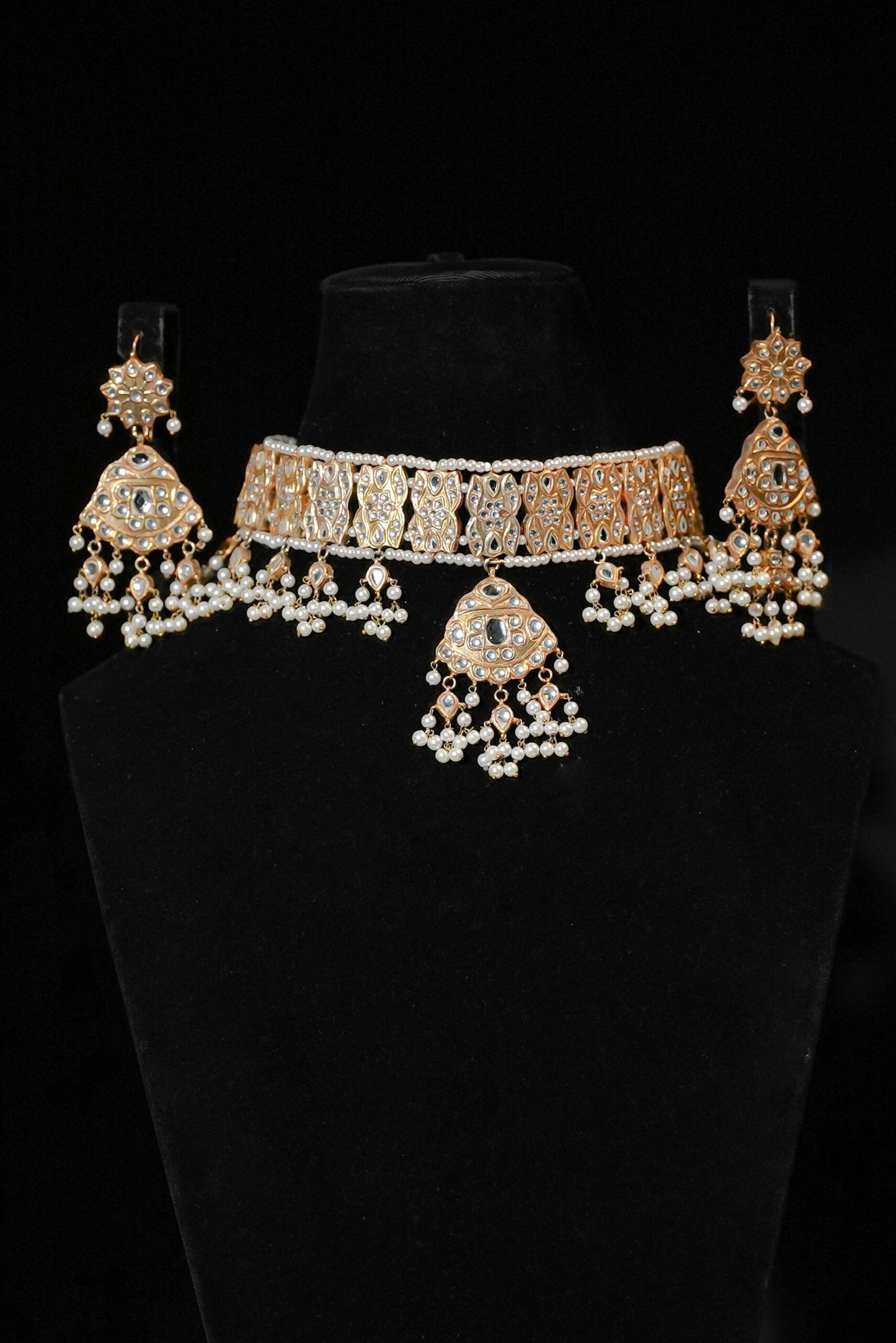 Key Features: Royal Design: A regal Kundan set featuring beautiful pearls, perfect for adding a luxurious touch to any outfit. Kundan Detailing: Intricate Kundan work that adds a royal charm and timeless beauty. Pearl Accents: Lustrous pearls that enhance the elegance of the Kundan stones. Versatile Elegance: Ideal for weddings, formal events, or any occasion that calls for a touch of royalty. A.S XPRESSION JEWELLERY; Kundan with Pearls Royal Set The Kundan with Pearls Royal Set is a true symbol of luxury and elegance. This set features intricate Kundan work paired with lustrous pearls, creating a royal design that adds sophistication to any occasion. The rich gold finish and the beautiful detailing of the pearls make this set a timeless addition to any jewellery collection. Whether you're attending a wedding, a grand celebration, or simply want to make a statement at any event, this set is perfect for those who appreciate the beauty of traditional craftsmanship and luxurious design.