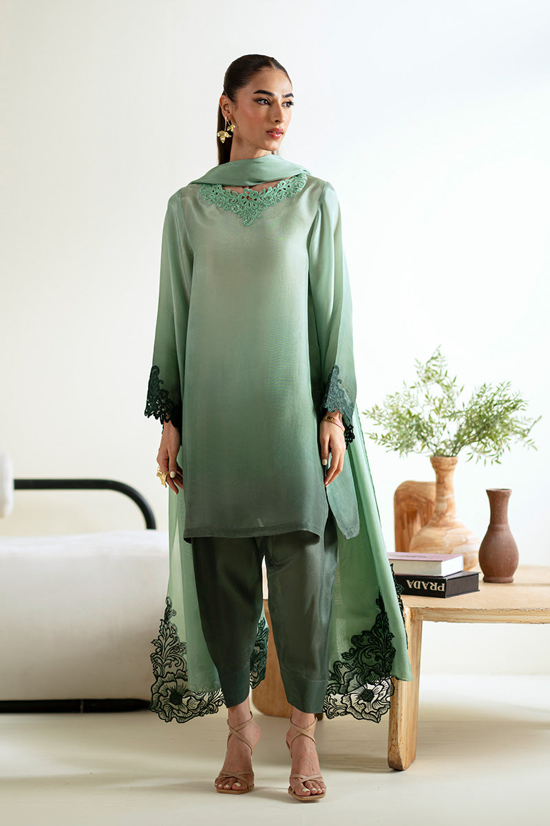 Effortless yet full of charm €” this gradient shirt comes with a delicately embroidered boat neckline and flared cutwork sleeves. Paired with a khari shalwar and a flowy silk dupatta, it€™s the kind of look that feels put-together without even trying.