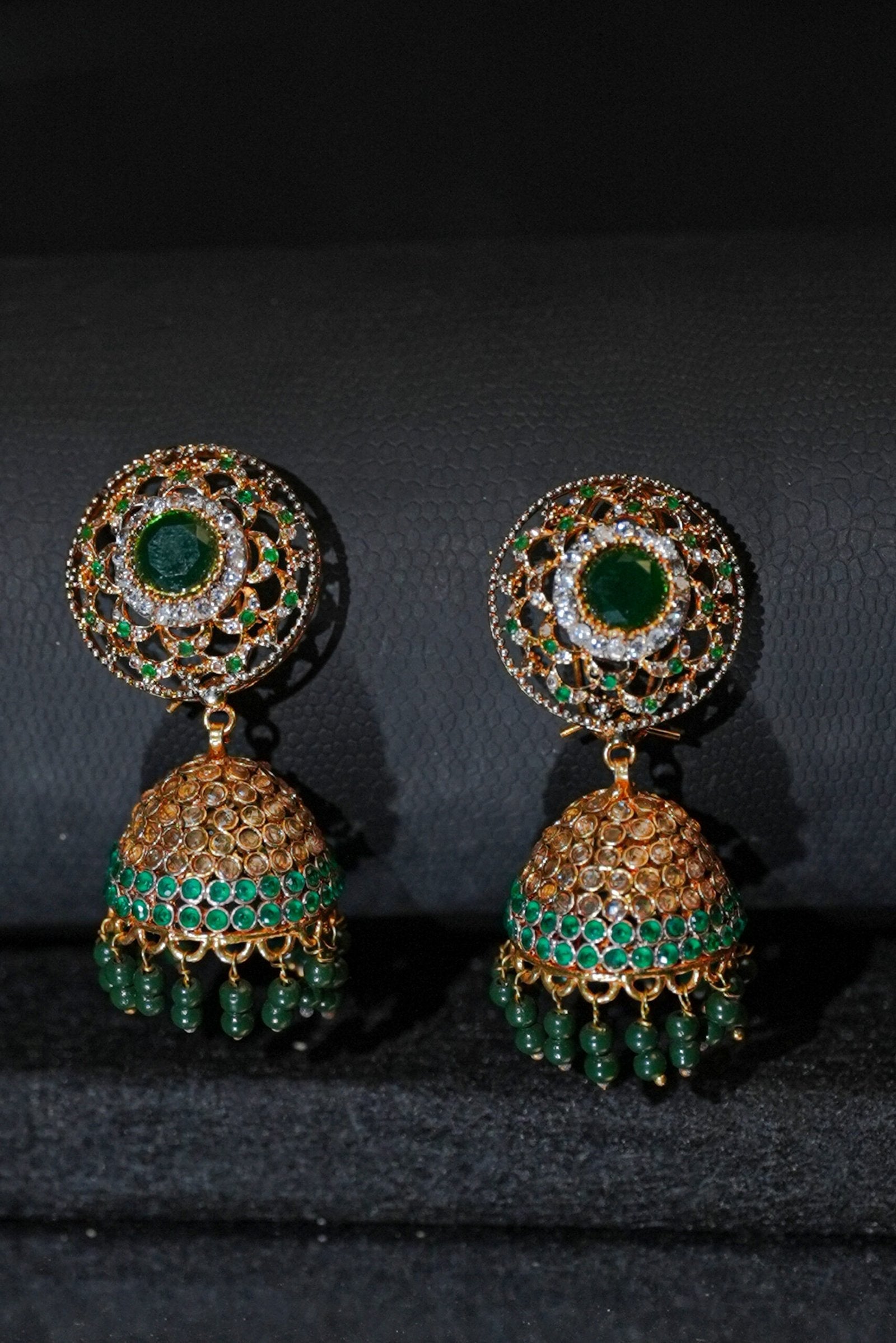 Key Features: Dome-Shaped Design: Bold, dome-shaped earrings offering a classic yet luxurious silhouette. Vibrant Green Stones: Rich green stones set at the center, adding a striking and vibrant touch. Intricate Goldwork: Detailed gold accents that elevate the design with a luxurious and refined finish. Green Hangings: Graceful green hangings that add movement and sophistication to the earrings. A.S XPRESSION JEWELLERY; Rich Green Dome Earrings with Detailed Goldwork and Green Hangings Elevate your look with these Rich Green Dome Earrings, featuring a luxurious dome shape with detailed goldwork that enhances their opulence. The rich green stones at the center are framed with intricate gold accents, creating a striking contrast. The earrings are further enhanced by delicate green hangings, adding an element of sophistication and movement. Perfect for weddings, formal events, or festive celebrations, these earrings bring a regal touch to any ensemble, making them a statement piece in your jewelry collection.