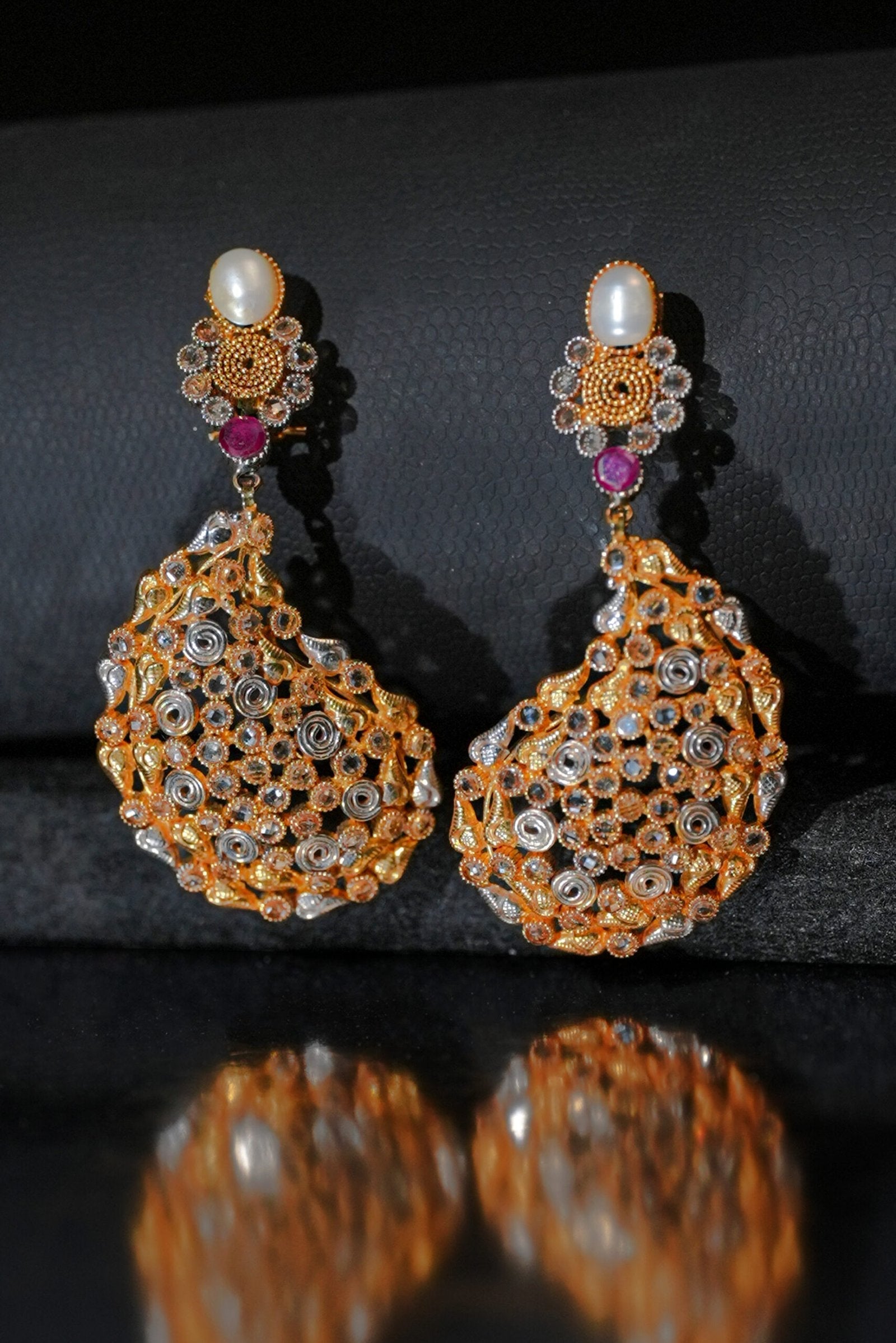 Key Features: Elegant Jhumka Design: Classic jhumkas with a modern twist, perfect for adding elegance to any look. Clustered Diamonds: Sparkling diamonds arranged in clusters for a luxurious and radiant effect. Pearl Top: A lustrous pearl top that enhances the overall sophistication of the design. Ideal for Special Occasions: Perfect for weddings, festive events, or any celebration that calls for a touch of glamour. A.S XPRESSION JEWELLERY; Sparkling Jhumkas with Clustered Diamonds and a Pearl Top Add a touch of luxury to your jewelry collection with these Sparkling Jhumkas, designed to captivate. Featuring clustered diamonds that catch the light beautifully, these earrings are elevated by a lustrous pearl top that adds timeless elegance. The jhumka design offers a traditional flair, while the diamonds and pearl bring a modern twist of opulence. Perfect for weddings, gala events, or any celebration, these earrings offer a refined, sparkling touch to any ensemble, making you the center of attention at any special occasion.