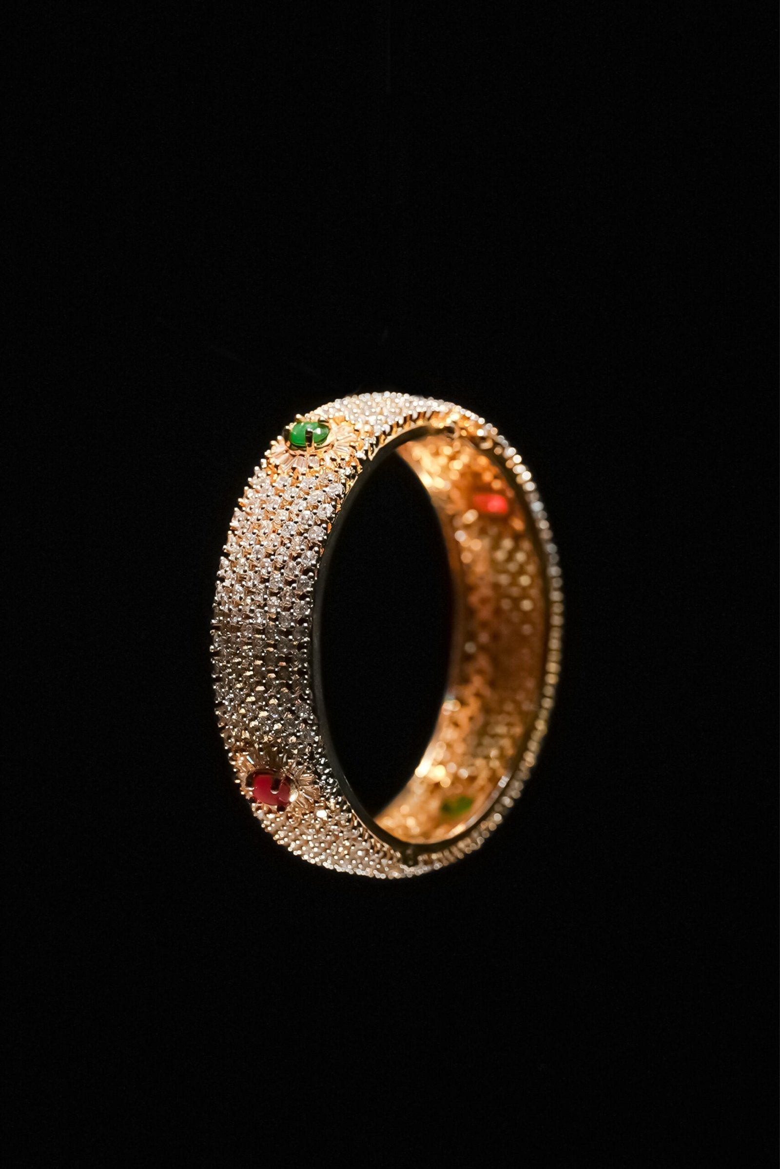 Key Features: Multi-Color Zircons: Rich, vibrant stones for a colorful, radiant finish. Golden Polish: High-shine gold plating for a luxurious feel. Traditional Kara Style: Classic shape with contemporary sparkle. Occasion Ready: Ideal for weddings, festivities, and standout moments. A.S XPRESSION JEWELLERY; Golden Multi-Color Zircon Kara Celebrate tradition with brilliance in our Golden Multi-Color Zircon Kara. Designed in a classic kara silhouette, this piece is adorned with a stunning mix of vibrant zircon stones, set against a glowing golden finish. The rich colors and refined shine create a bold, festive look that speaks of culture, elegance, and individuality. Whether worn solo or as part of a set, this kara is made to stand out. Perfect for weddings, festivals, and special occasions, the Golden Multi-Color Zircon Kara adds timeless sparkle and modern energy to your jewelry collection.